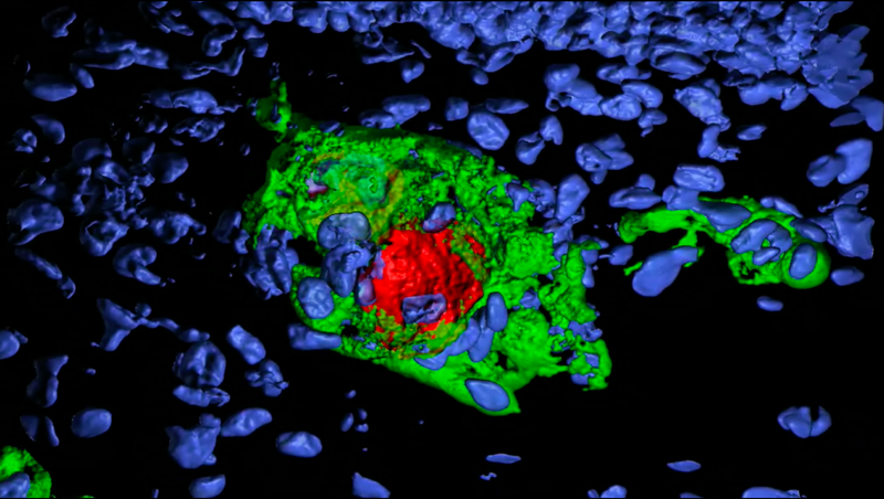 hiPSC-derived sebocytes seeded within LabSkin matriX porous scaffold self-organize into well-defined 3D organoids embedded into extracellular matrix neo-synthetized by human fibroblasts.