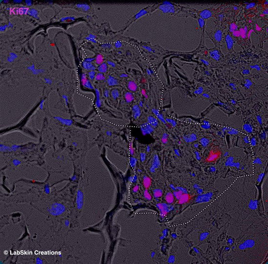 By combining LabSkin advanced scaffolding biomaterials made of collagens, GAG and chitosan optimised in composition, proportion and porosity with innovative cell culture technologies, LabSkin Creations developed the first worldwide 3D full-thickness skin model including sebocyte organoids derived from human iPSC.